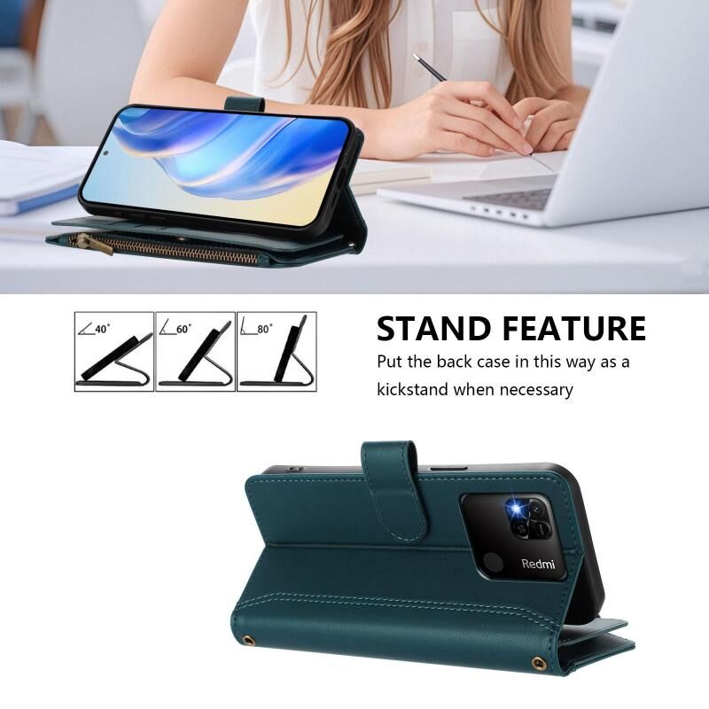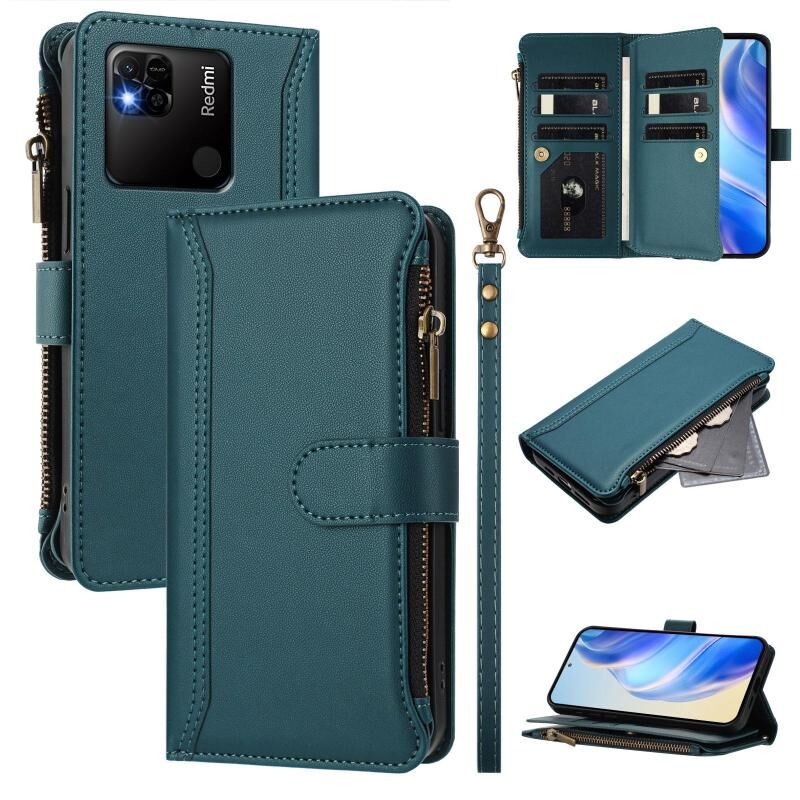 Για Redmi 10A / 9C Μαγνητικό Κλείσιμο 9 Θήκες Κάρτας Δερμάτινη Θήκη με Φερμουάρ και Λουρί Χεριού (Σκούρο πράσινο)
