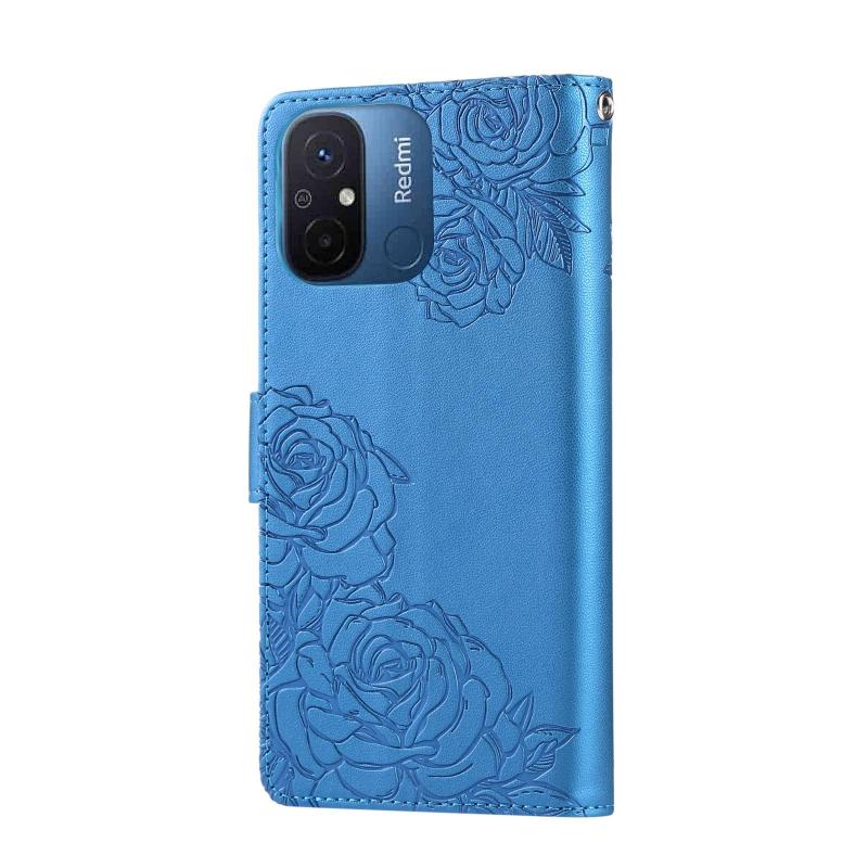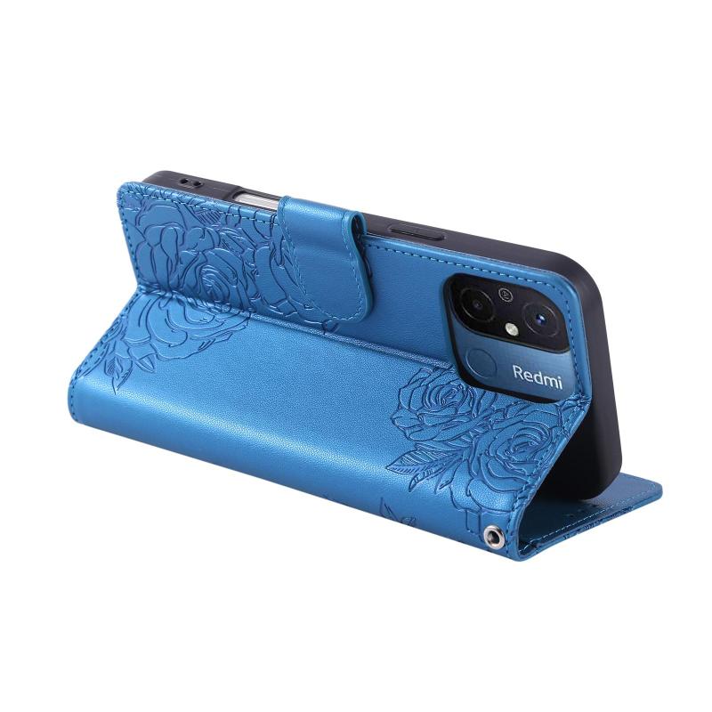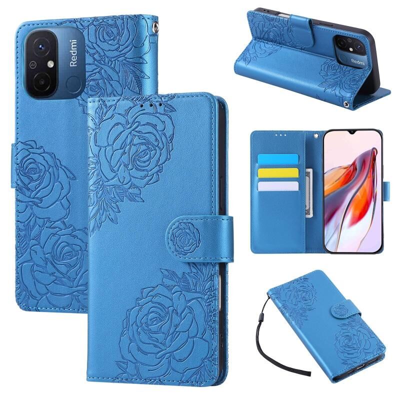 For Redmi 11A 4G Global Rose Flower Embossed 3-Card Slots Leather Phone Case(Blue)
