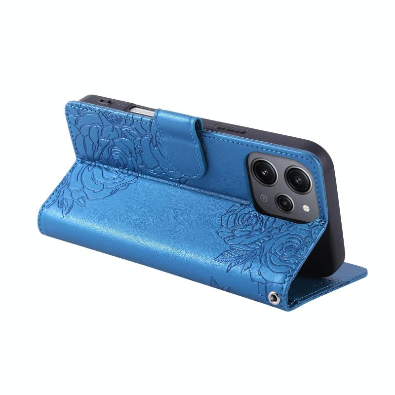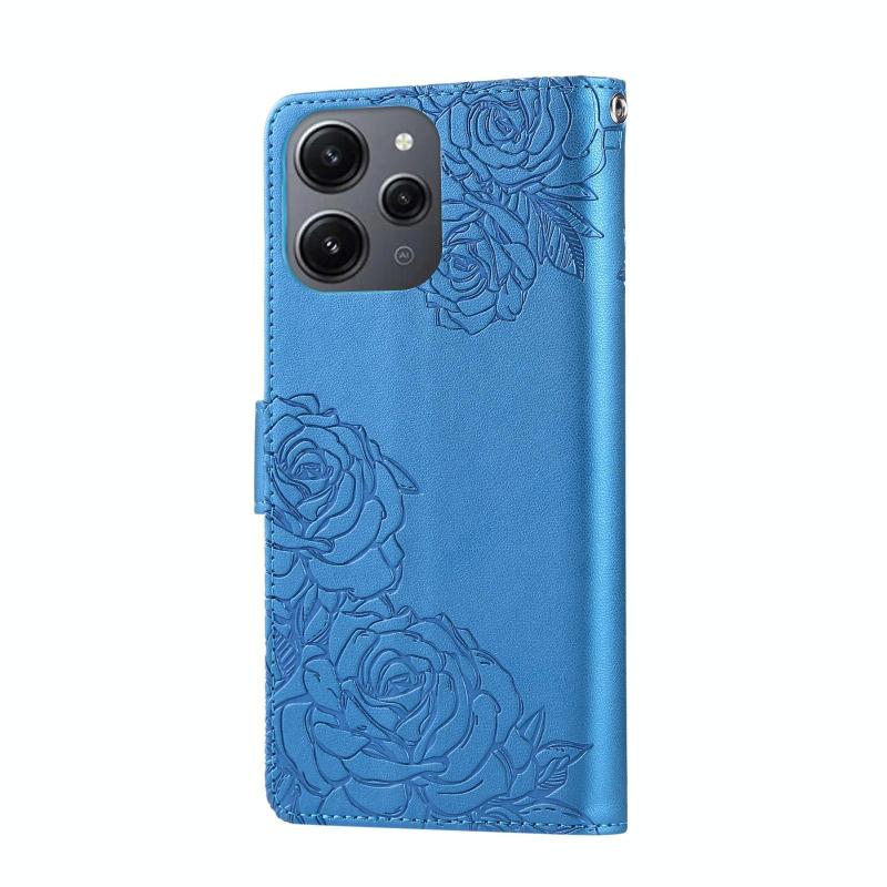 For Redmi 12 4G / 5G / Note 12R Rose Flower Embossed 3-Card Slots Leather Phone Case(Blue)