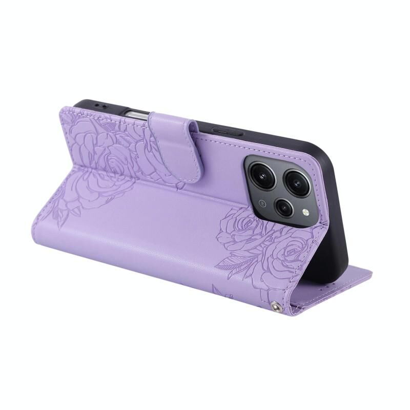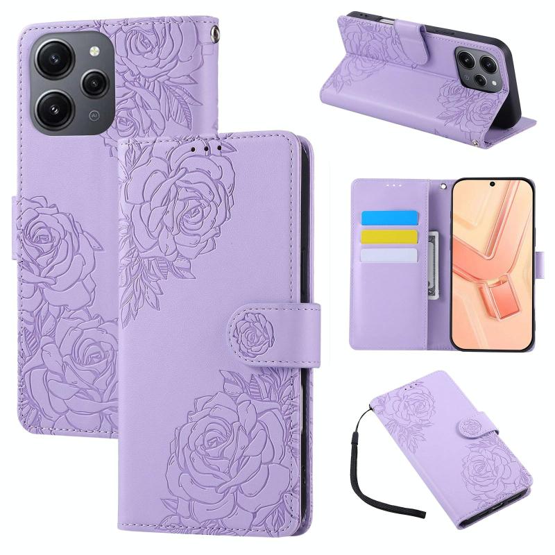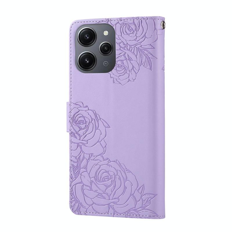 For Redmi 12 4G / 5G / Note 12R Rose Flower Embossed 3-Card Slots Leather Phone Case(Purple)