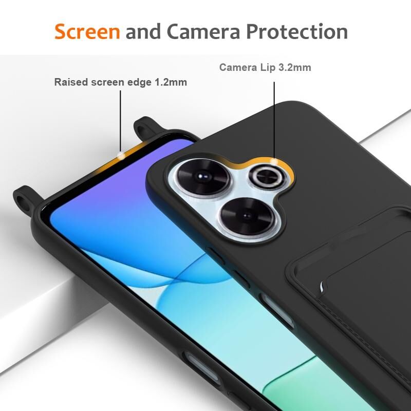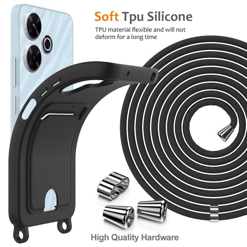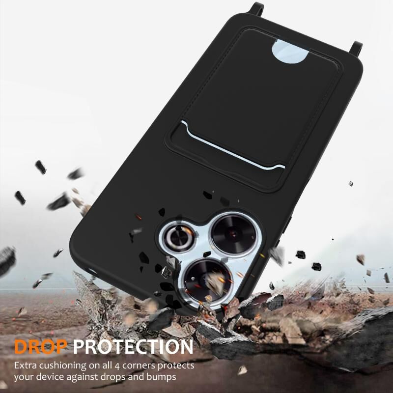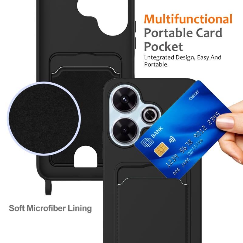 Για Redmi 13 4G / 5G / Σημείωση 13R 5G ενσωματωμένη κάρτα τσάντα τσάντα στερεό χρώμα υγρό σιλικόνης τηλέφωνο υπόθεση με κορδόνι (μαύρο)