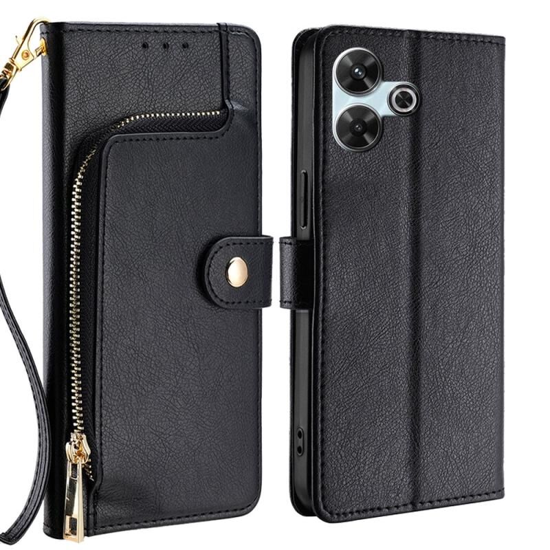 Για Redmi 13 4G φερμουάρ τσάντα δερμάτινη θήκη τηλεφώνου (μαύρο)