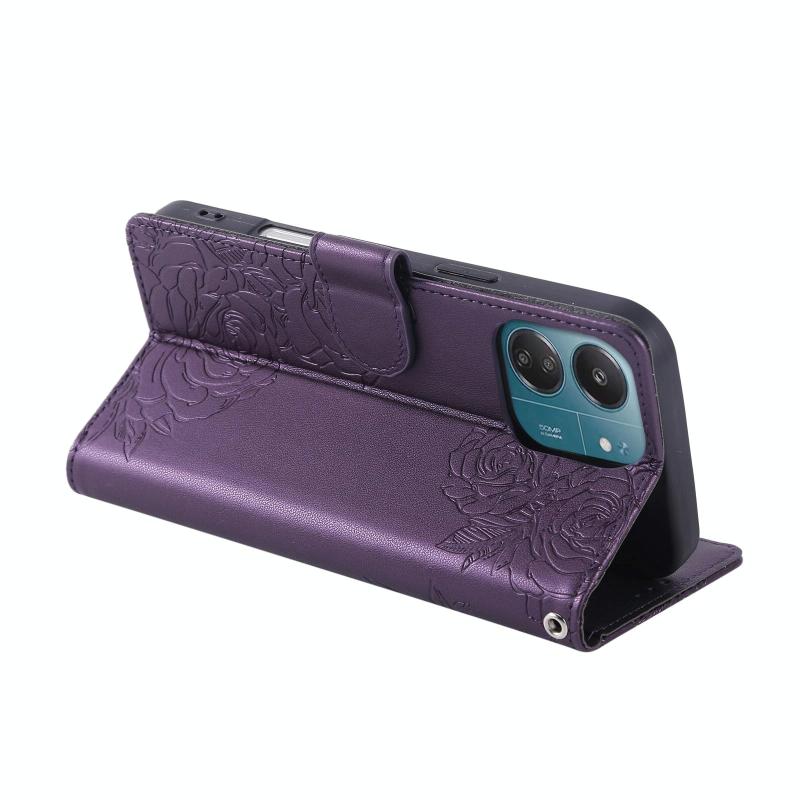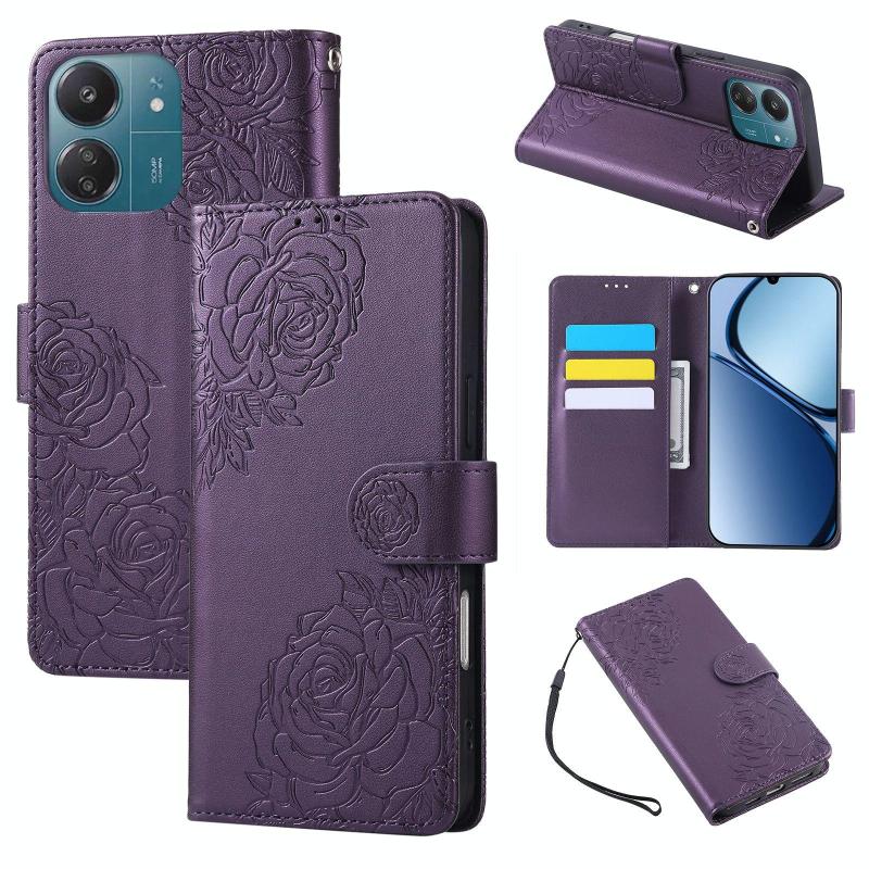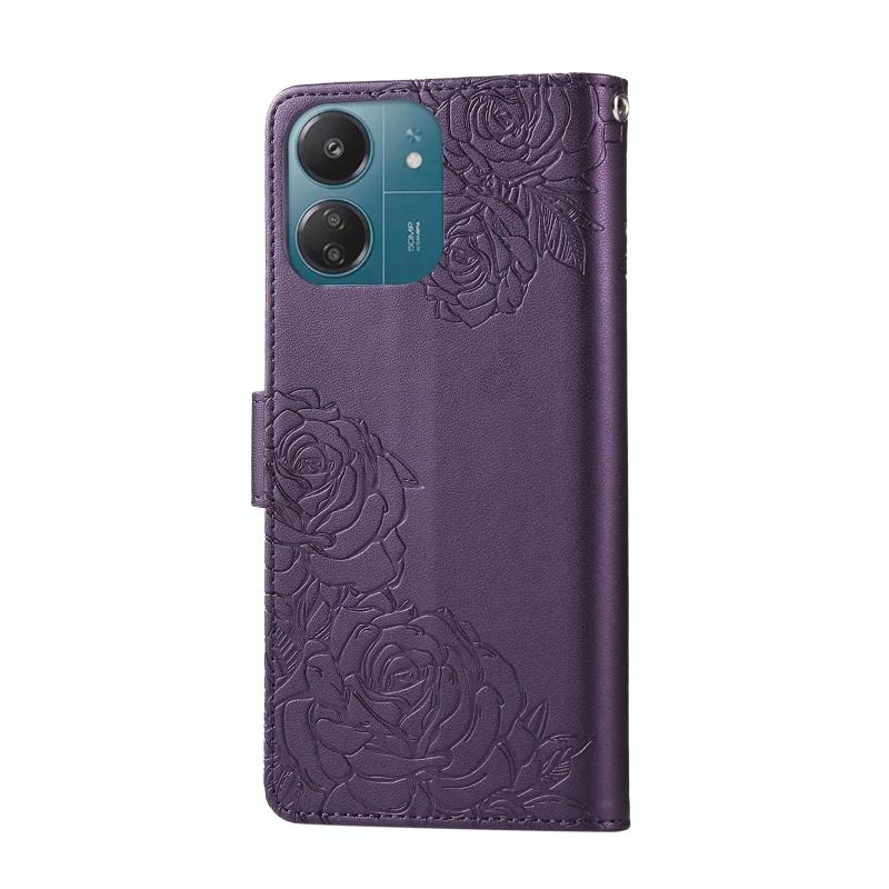 For Redmi 13C 4G / 5G / Poco C65 Rose Flower Embossed 3-Card Slots Leather Phone Case(Deep Purple)