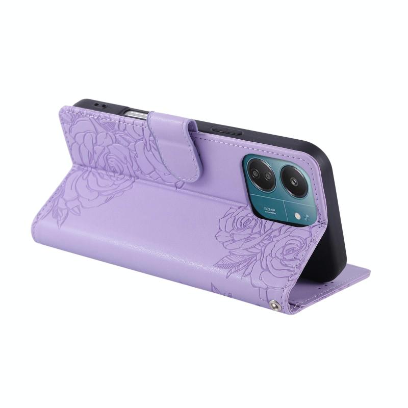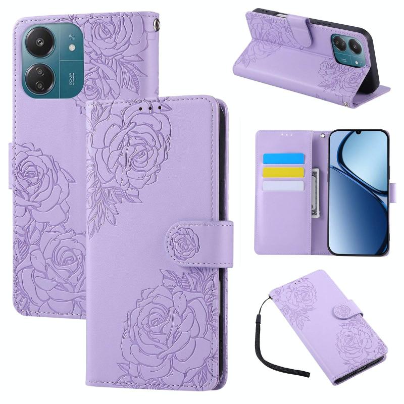 For Redmi 13C 4G / 5G / Poco C65 Rose Flower Embossed 3-Card Slots Leather Phone Case(Purple)