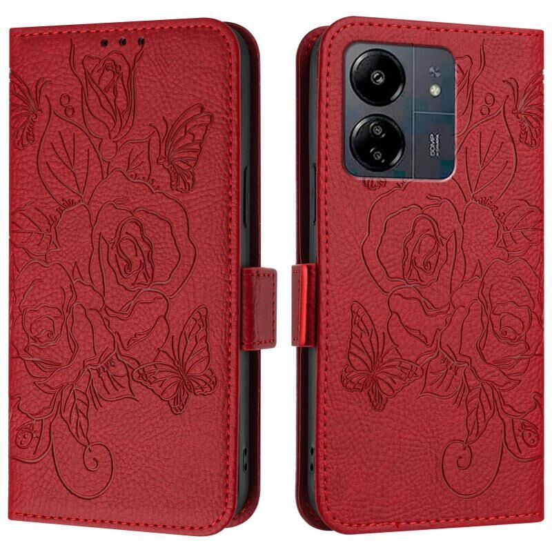 Για Redmi 13C 4G Global / Xiaomi Poco C65 ανάγλυφο Rose RFID Anti-theft δερμάτινη θήκη τηλεφώνου (κόκκινο)