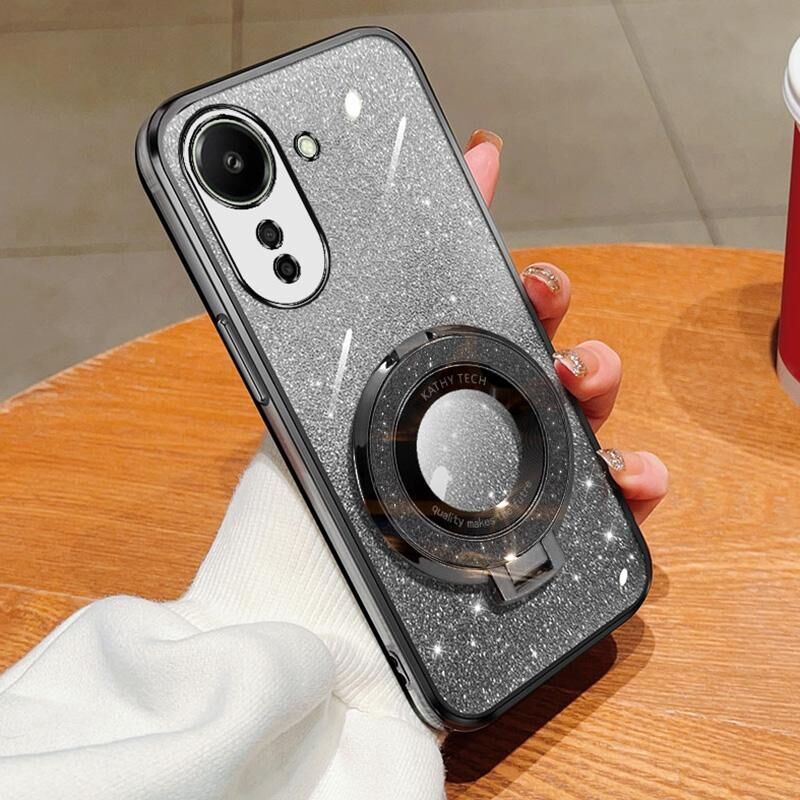Για Redmi 13C 4G επιμεταλλωμένο βαθμιδωτή Glitter στρογγυλή θήκη TPU τηλέφωνο κάτοχος (μαύρο)