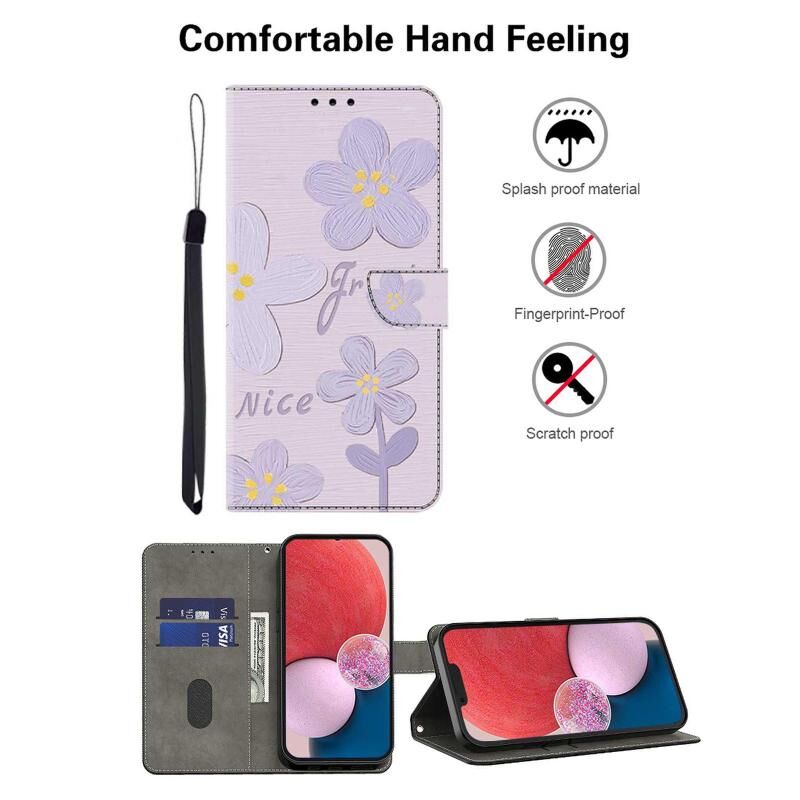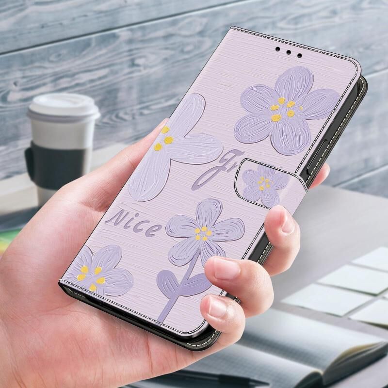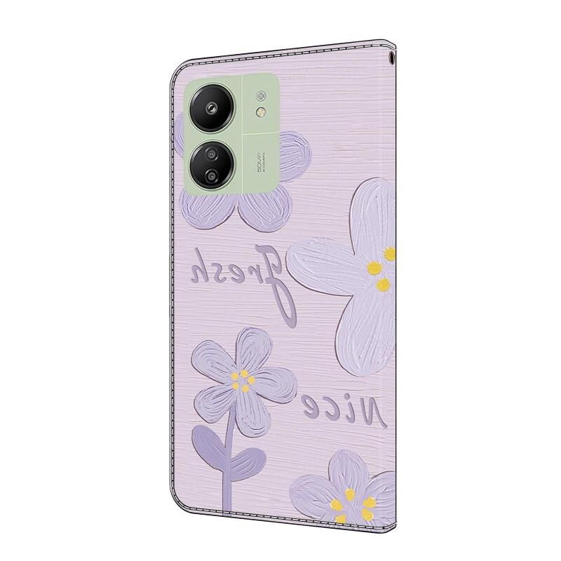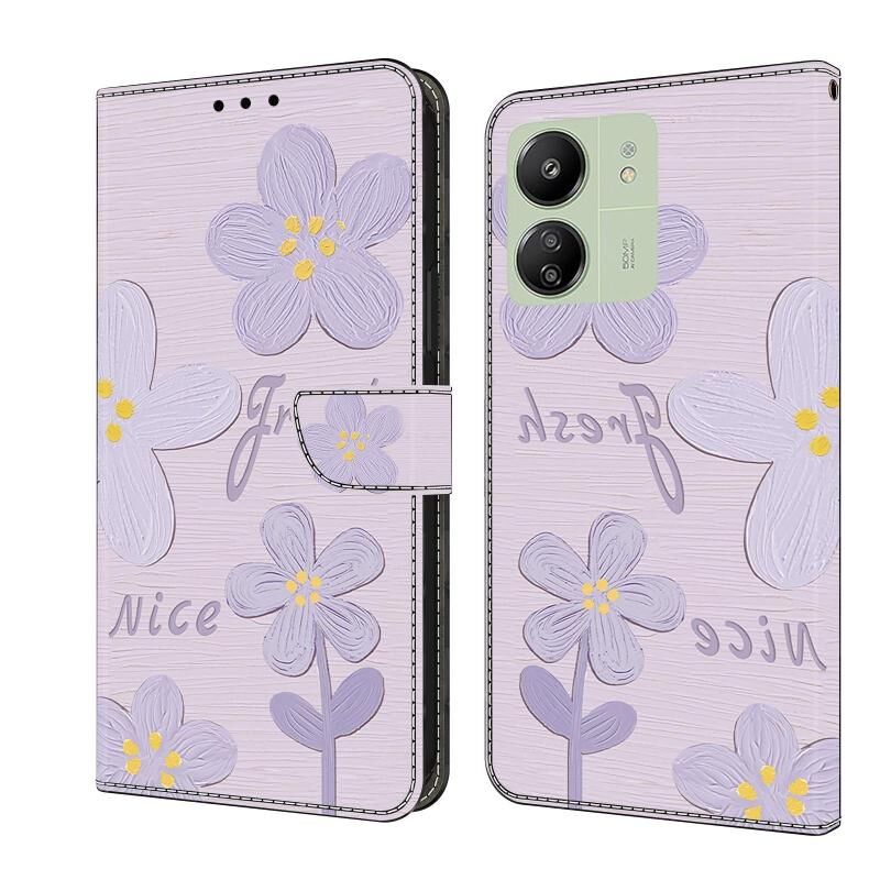Θήκη τηλεφώνου από φρέσκο ​​βαμμένο δέρμα για Redmi 13C (Μωβ λουλούδια ζωγραφικής με λάδι)