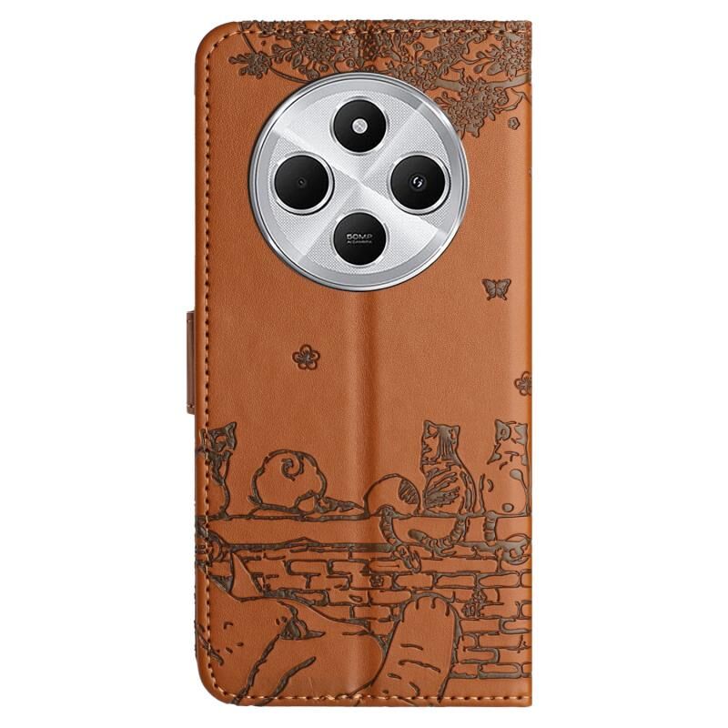 Για Redmi 14C 4G Cat ανάγλυφο μοτίβο δερμάτινη θήκη τηλεφώνου με κορδόνι (καφέ)