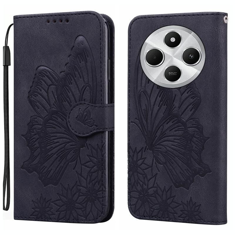 Θήκη τηλεφώνου από δέρμα με οριζόντιο άνοιγμα για Redmi 14C 4G, με ανάγλυφο σχέδιο πεταλούδων και ρετρό αίσθηση (Μαύρο)
