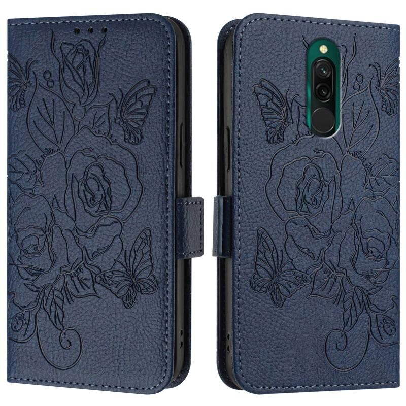 Για Redmi 8 ανάγλυφο Rose RFID Anti-theft δερμάτινη θήκη τηλεφώνου (σκούρο μπλε)