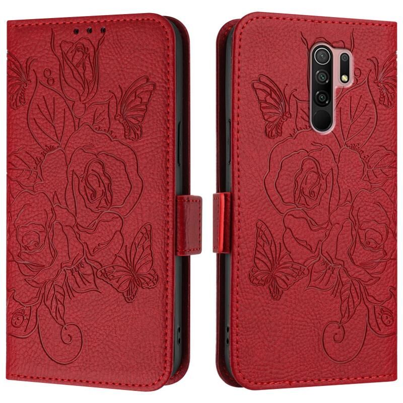 Για Redmi 9 / 9 Prime Ινδία ανάγλυφο Rose RFID Anti-theft δερμάτινη θήκη τηλεφώνου (κόκκινο)