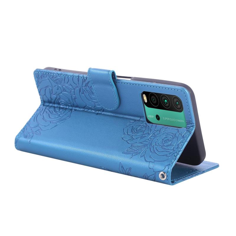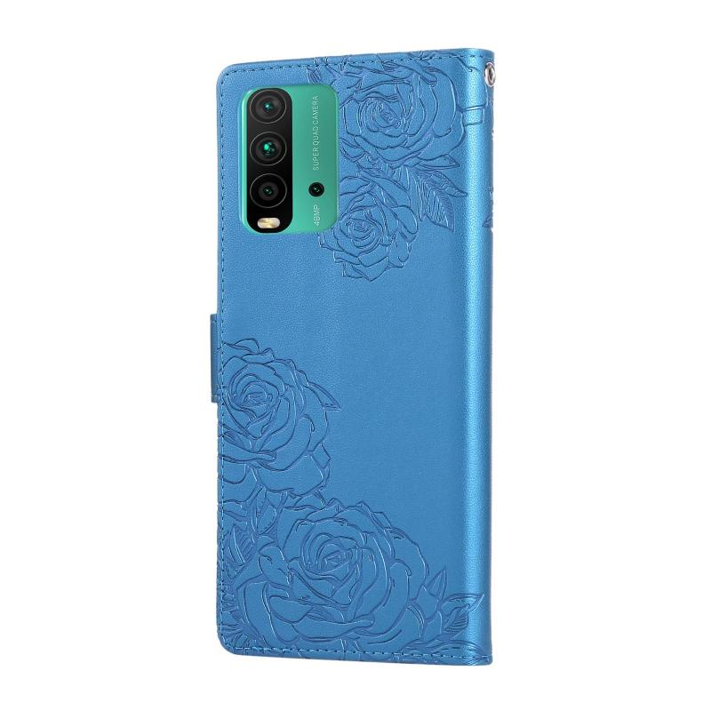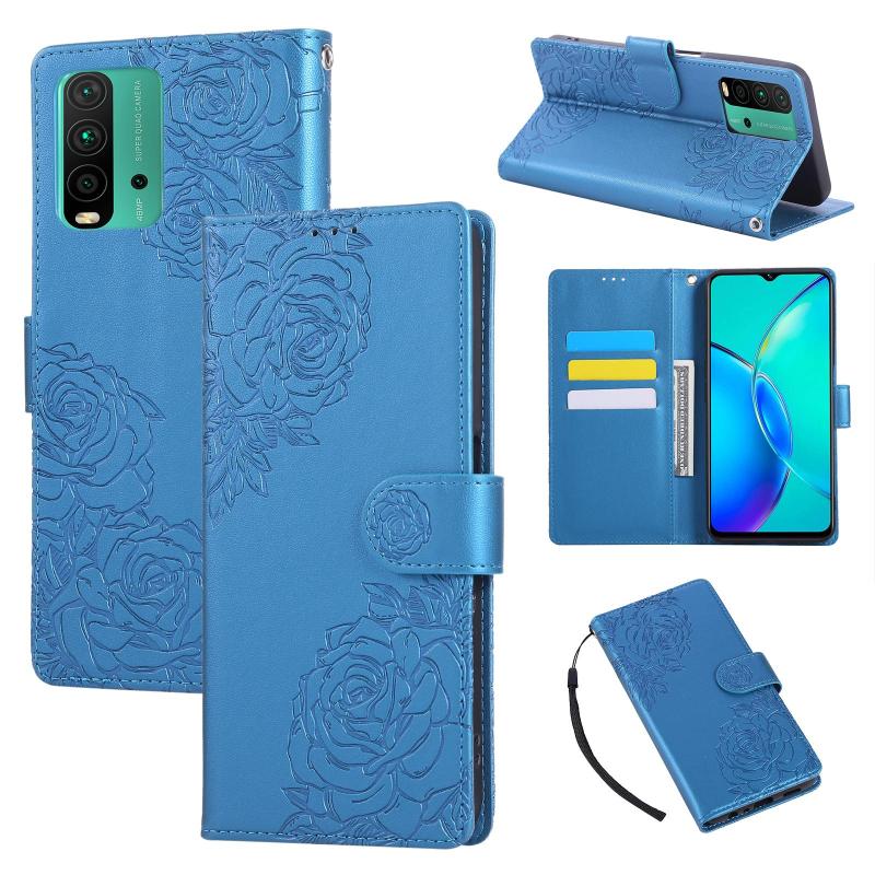 For Redmi 9T / Note 9 Power Rose Flower Embossed 3-Card Slots Leather Phone Case(Blue)