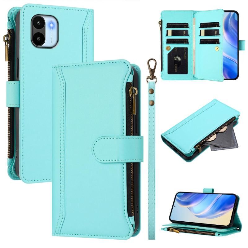 For Redmi A1 / A2 Magnetic Closure 9 Card Slots Zipper Leather Case with Hand Strap(Mint Green)