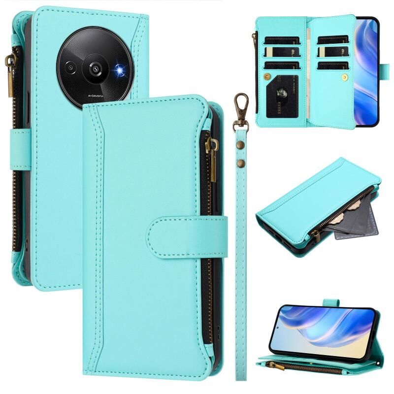 Για Redmi A3 / A3x / Poco C61 Μαγνητικό Κλείσιμο 9 Θήκες Κάρτας Δερμάτινη Θήκη με Φερμουάρ και Λουρί Χεριού (Μέντας πράσινο)