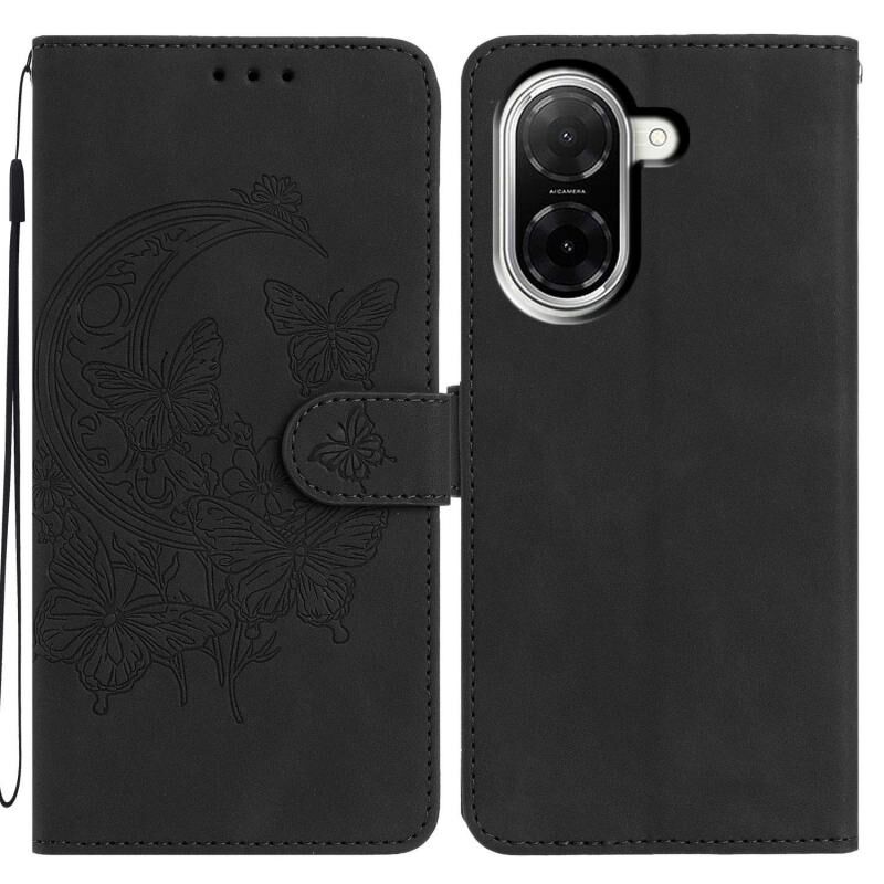 Θήκη τηλεφώνου από δέρμα με ανάγλυφο σχέδιο χορού πεταλούδας στο φως του φεγγαριού για Redmi A5 4G 171.7mm (Μαύρο)