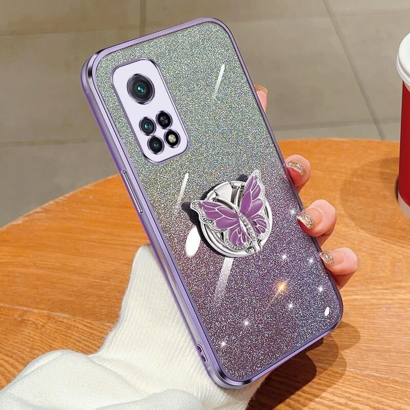 Για Redmi K30S / K30S Ultra Plated βαθμιδωτή Glitter πεταλούδα κάτοχος TPU τηλέφωνο υπόθεση (Μωβ)