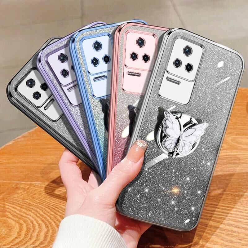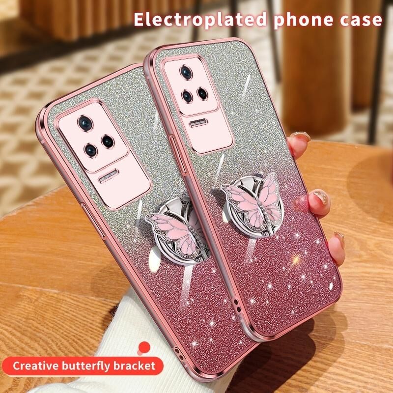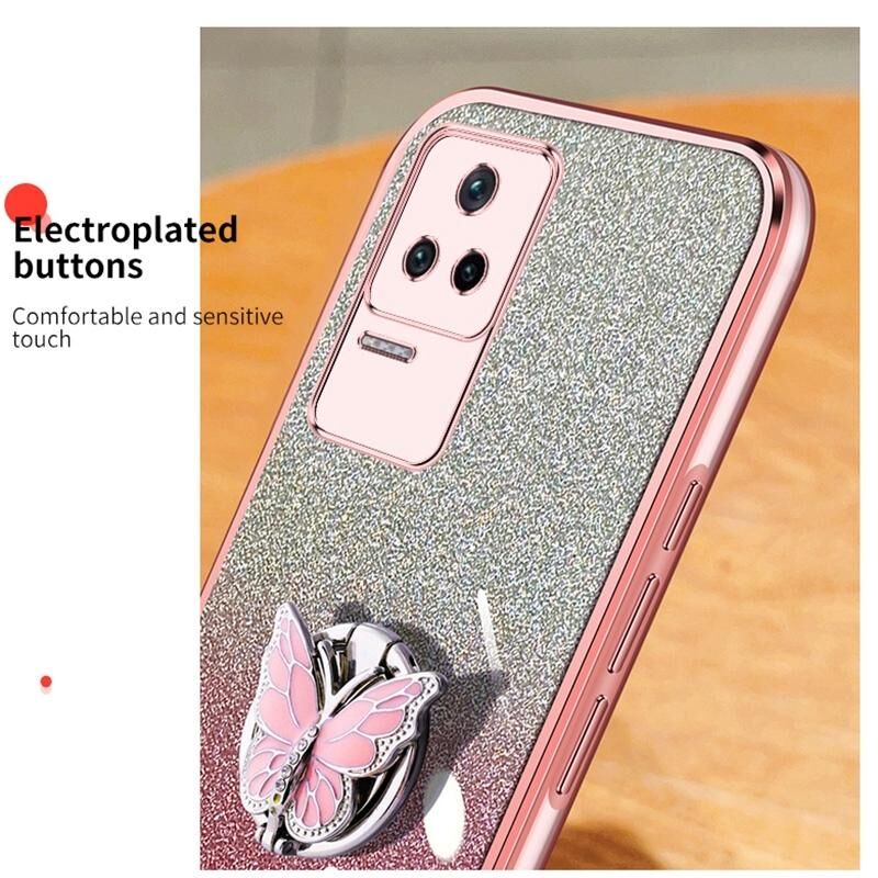 Για Redmi K40S Επιμεταλλωμένο διαβάθμιση Glitter πεταλούδα κάτοχος TPU τηλέφωνο υπόθεση (ροζ)