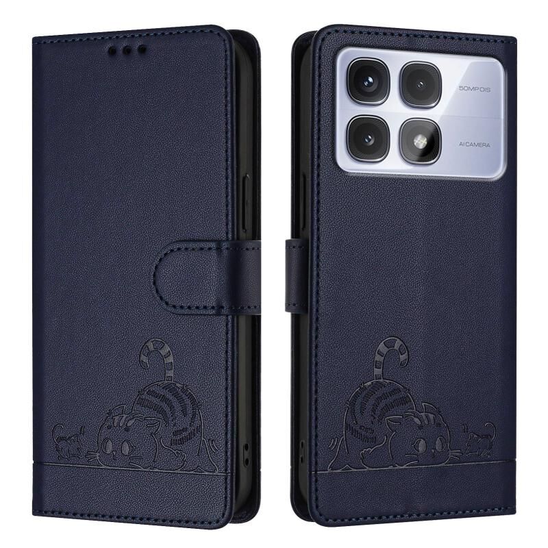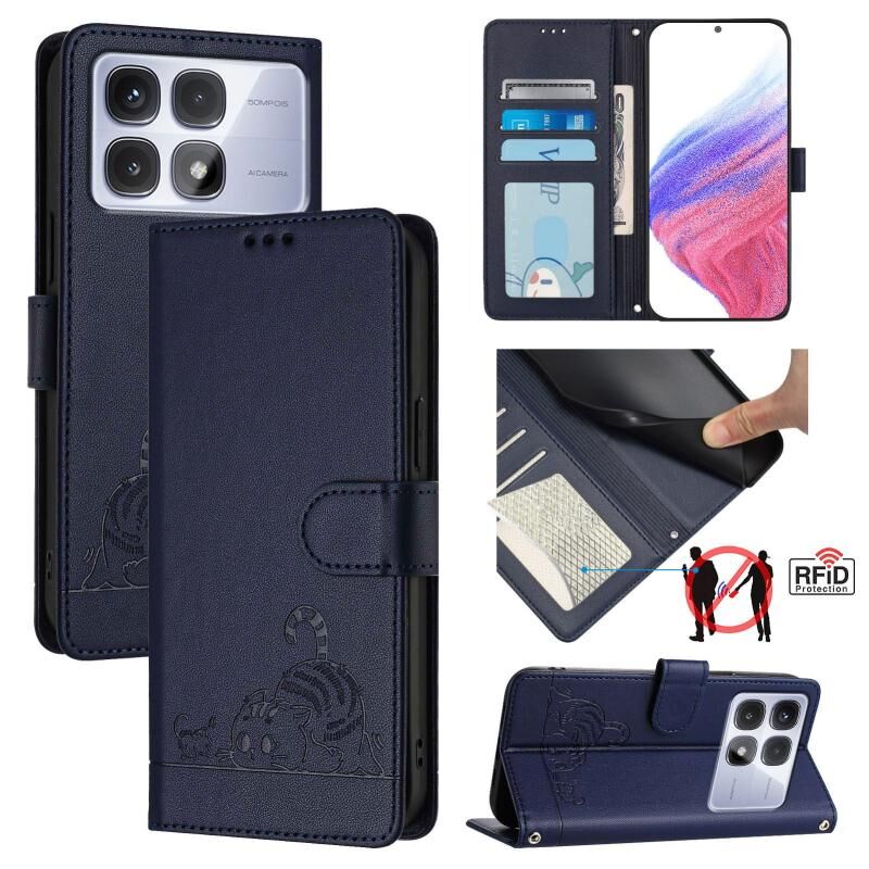 Θήκη τηλεφώνου από δέρμα με ανάγλυφο σχέδιο γάτας και RFID για Redmi K70 Ultra 5G Global με κορδόνι (Μπλε)