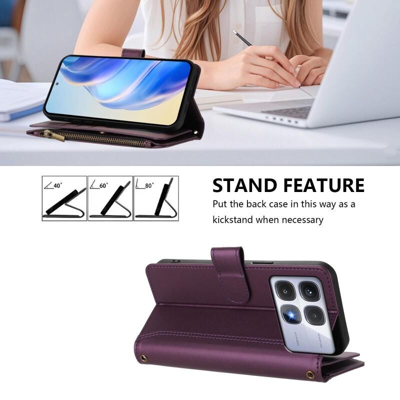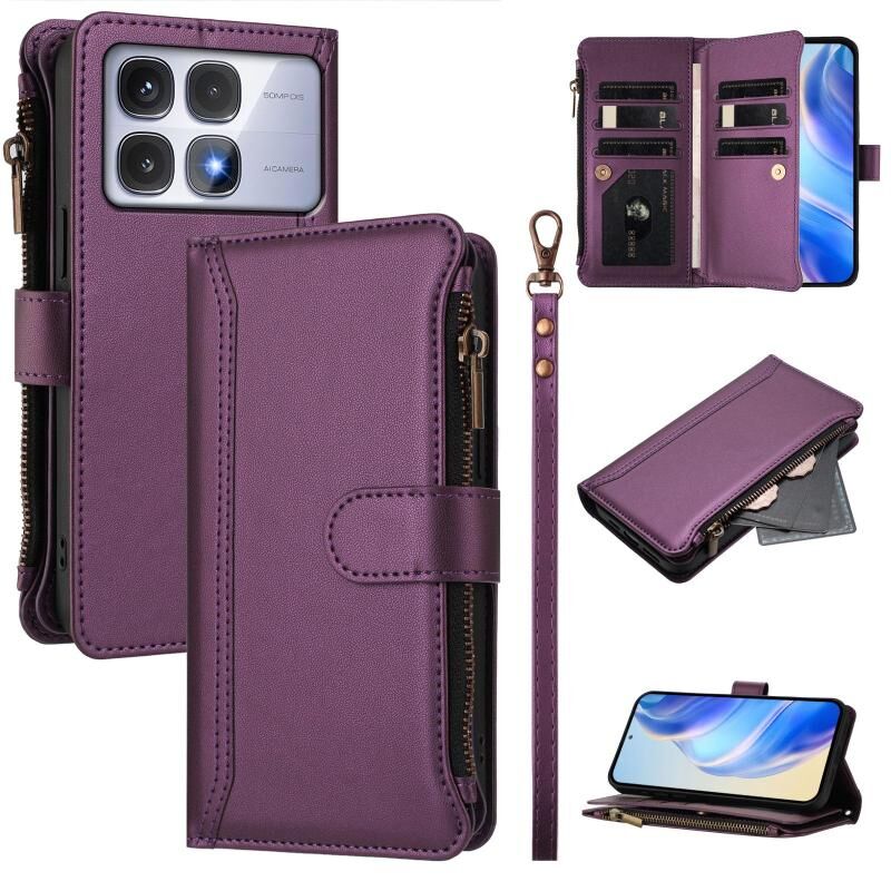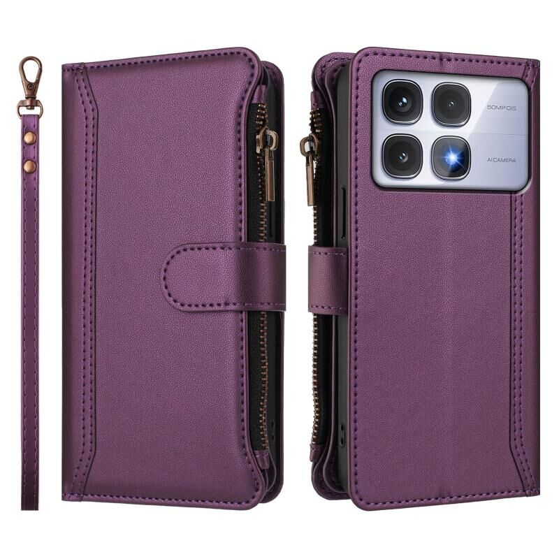 Θήκη δέρματος με μαγνητικό κλείσιμο, φερμουάρ και λουρί χειρός για Redmi K70 Ultra, 9 θέσεις για κάρτες (Σκούρο Μπλε)