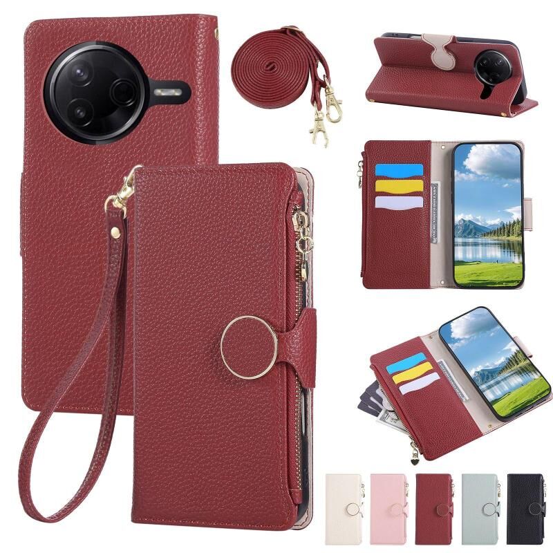 Θήκη κινητού τηλεφώνου από δέρμα με αγκράφα και φερμουάρ για Redmi K80 / Poco F7 Pro με λουρί χιαστί (Κόκκινο)
