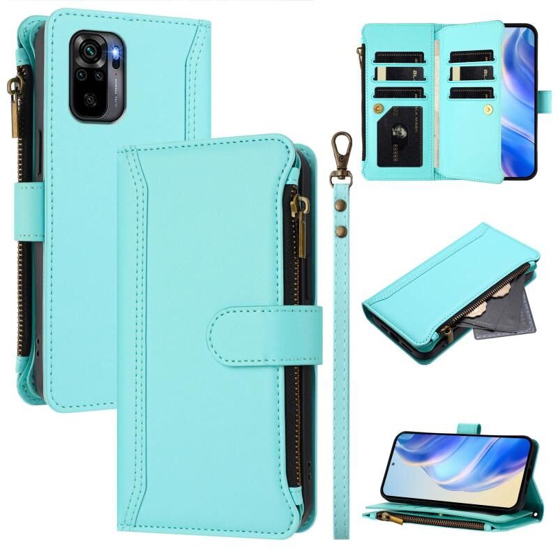 For Redmi Note 10 4G / Note 10S / Poco M5s Magnetic Closure 9 Card Slots Zipper Leather Case with Hand Strap(Mint Green)