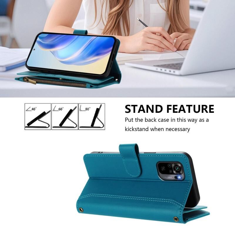 For Redmi Note 10 4G / Note 10S / Poco M5s Magnetic Closure 9 Card Slots Zipper Leather Case with Hand Strap(Turquoise)
