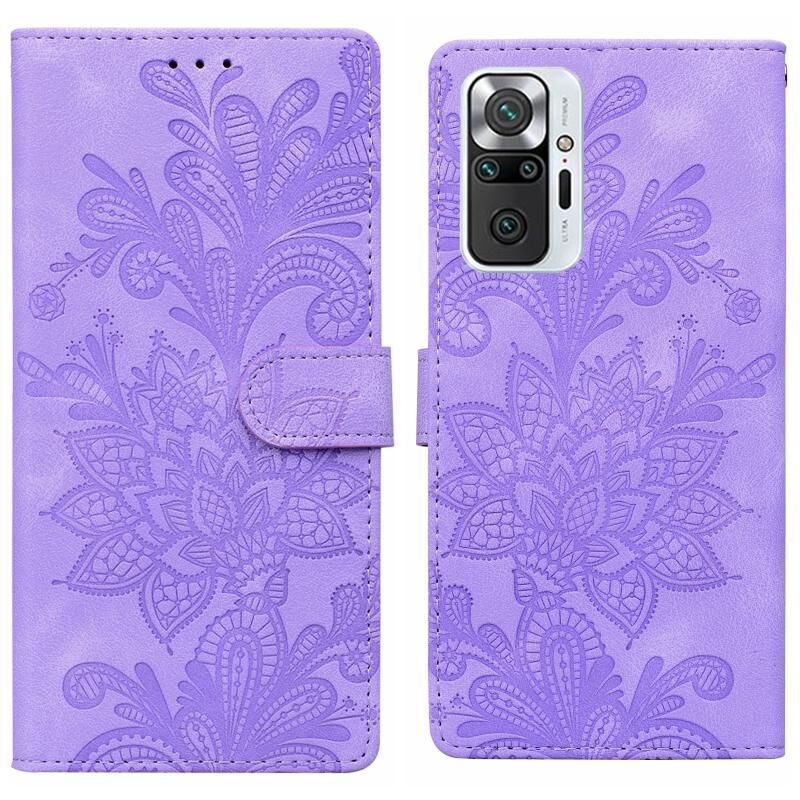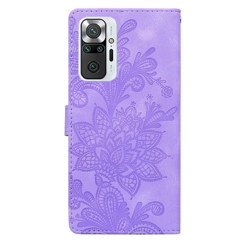 Θήκη τηλεφώνου για Redmi Note 10 Pro 4G με δαντελένιο λουλουδάτο ανάγλυφο, μαγνητικό κούμπωμα και λουρί καρπού (Μωβ)