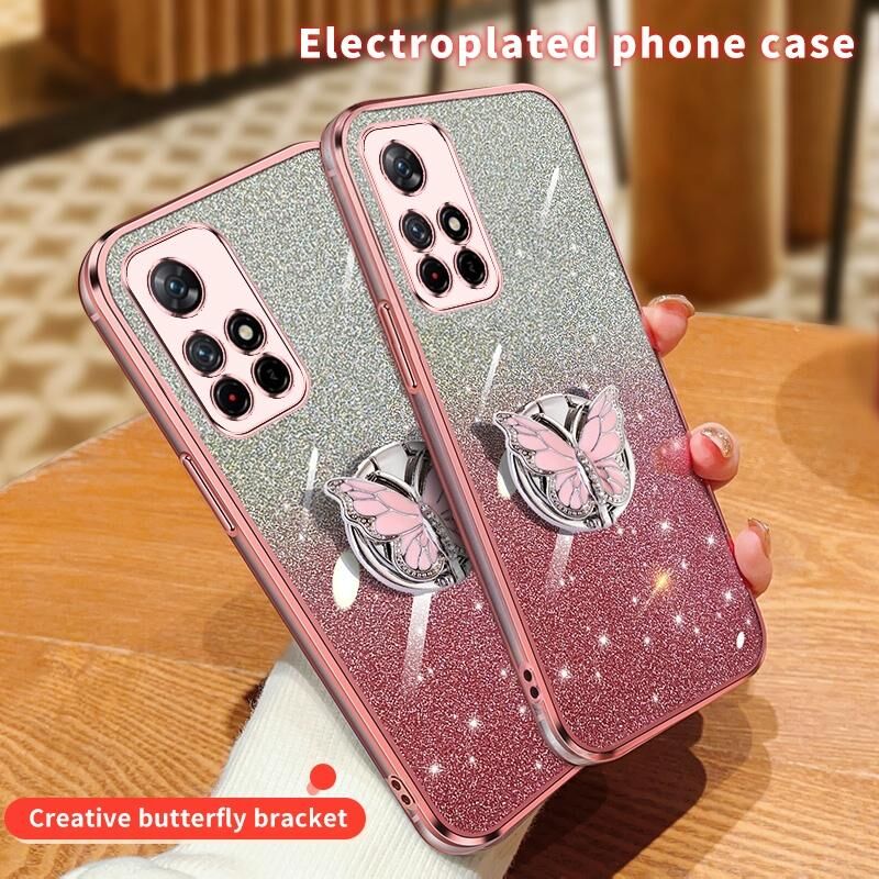 Για Redmi Σημείωση 11 5G Επιμεταλλωμένο διαβάθμιση Glitter πεταλούδα κάτοχος TPU τηλέφωνο υπόθεση (μαύρο)