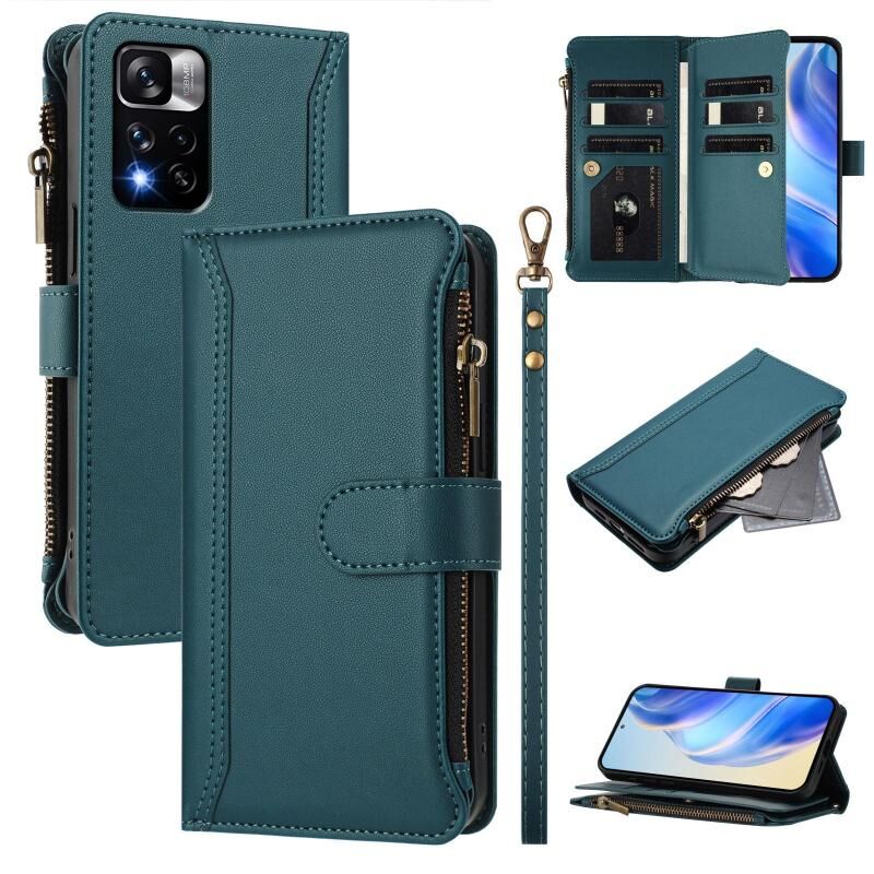 Για Redmi Note 11 Pro+ 5G EU / Poco X4 NFC Μαγνητικό Κλείσιμο 9 Θήκες Κάρτας Δερμάτινη Θήκη με Φερμουάρ και Λουρί Χεριού (Σκούρο πράσινο)