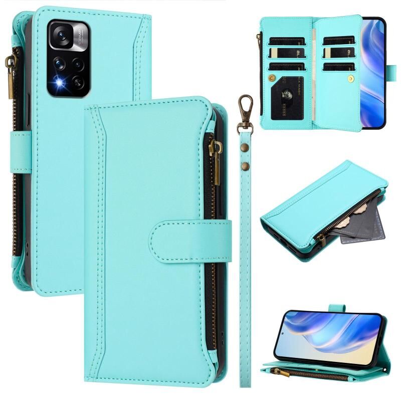 Για Redmi Note 11 Pro+ 5G EU / Poco X4 NFC Μαγνητικό Κλείσιμο 9 Θήκες Κάρτας Δερμάτινη Θήκη με Φερμουάρ και Λουρί Χεριού (Μέντας πράσινο)