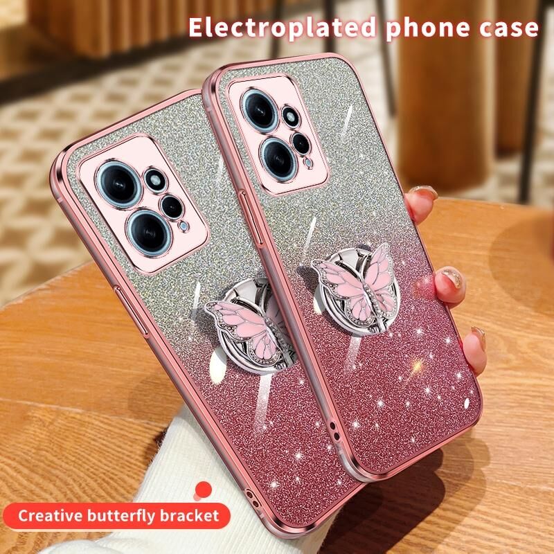 Για Redmi Σημείωση 12 4G Παγκόσμια επιμεταλλωμένη διαβάθμιση Glitter πεταλούδα κάτοχος TPU τηλέφωνο υπόθεση (μωβ)