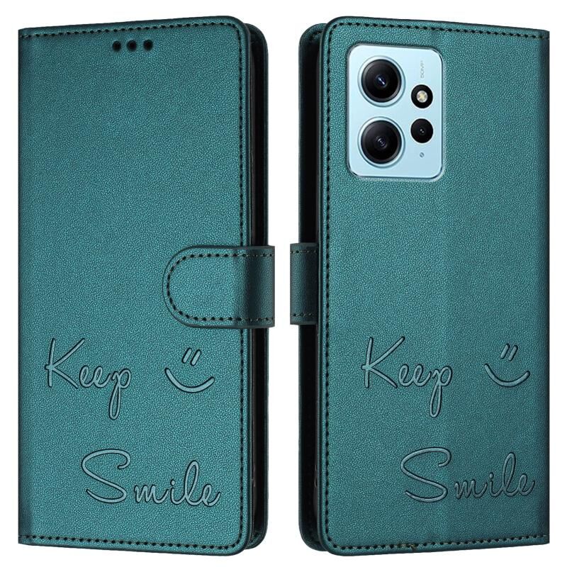 Για Redmi Σημείωση 12 4G Παγκόσμια χαμόγελο ανάγλυφο RFID δερμάτινη θήκη τηλεφώνου (Peacock Green)