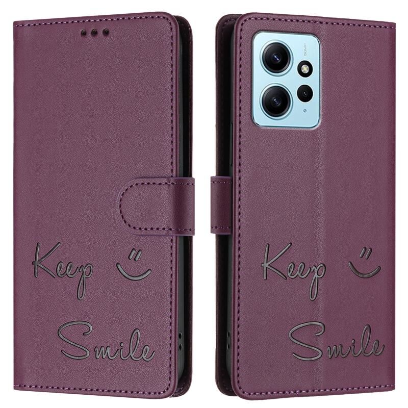 Για Redmi Σημείωση 12 4G Παγκόσμια χαμόγελο ανάγλυφο RFID δερμάτινη θήκη τηλεφώνου (Violet)