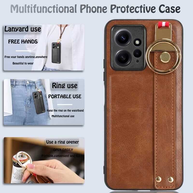 Για Redmi Note 12 4G Παγκόσμια Wristband δέρμα πίσω τηλέφωνο υπόθεση (Καφέ)