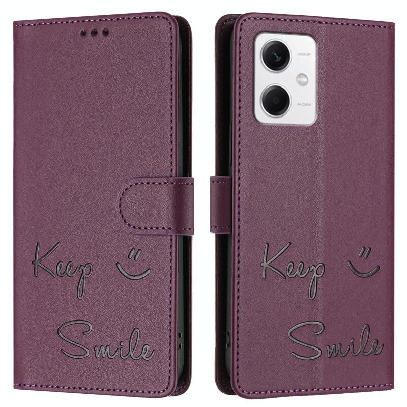 Για Redmi Σημείωση 12 5G Παγκόσμια / Ινδία Χαμόγελο ανάγλυφο RFID δερμάτινη θήκη τηλεφώνου (Violet)