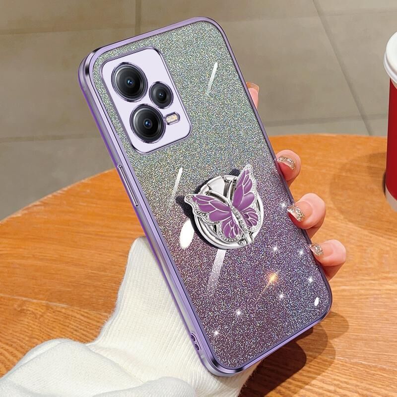 Για Redmi Σημείωση 12 5G Παγκόσμια επιμεταλλωμένη διαβάθμιση Glitter πεταλούδα κάτοχος TPU τηλέφωνο υπόθεση (μωβ)