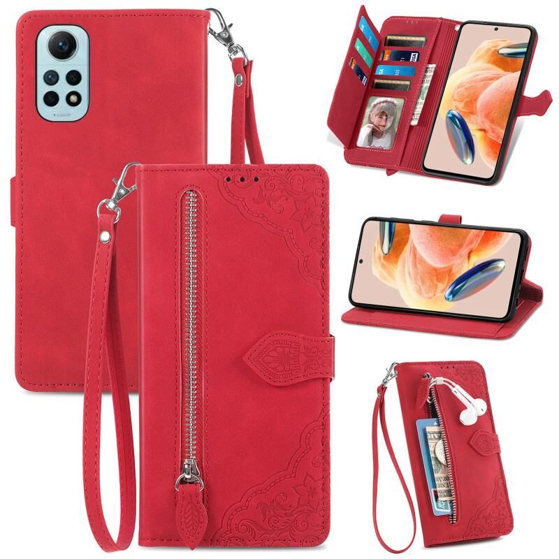 Για Redmi Σημείωση 12 Pro 4G Παγκόσμια ανάγλυφο λουλούδι φερμουάρ δερμάτινη θήκη τηλεφώνου (κόκκινο)