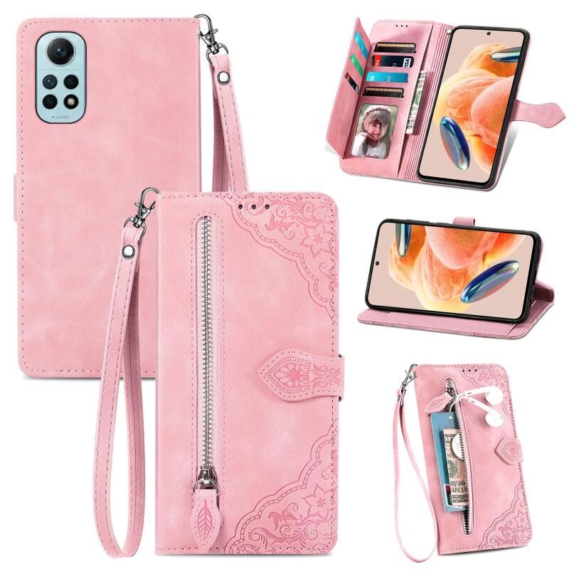 Για Redmi Σημείωση 12 Pro 4G Παγκόσμια ανάγλυφο λουλούδι φερμουάρ δερμάτινη θήκη τηλεφώνου (Rose Gold)