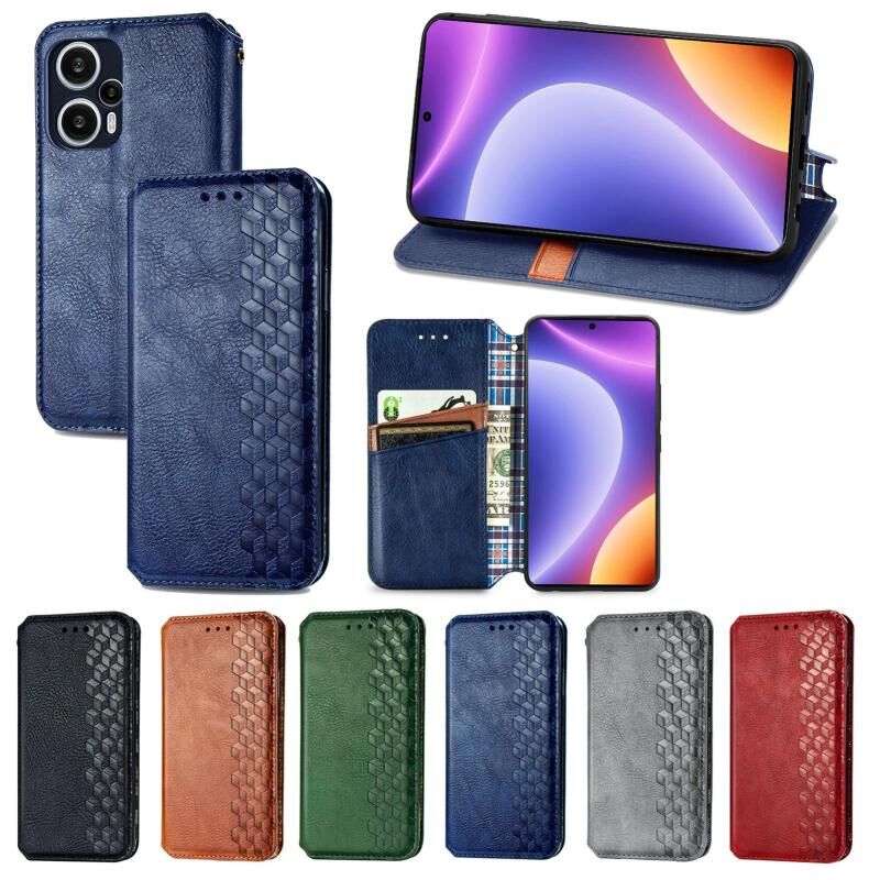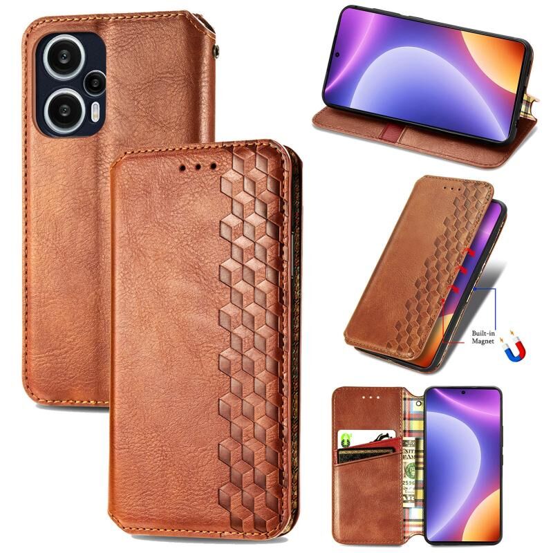 Για Redmi Note 12 Turbo κυβικό πλέγμα πιέζεται μαγνητική δερμάτινη θήκη τηλεφώνου (καφέ)