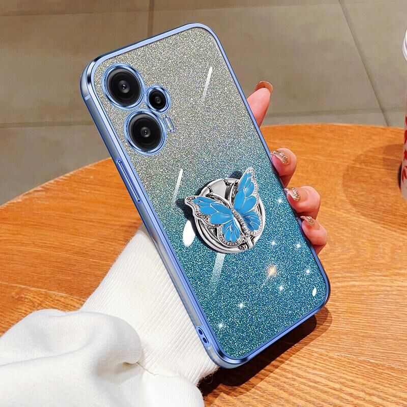 Για Redmi Σημείωση 12 Turbo Επιμεταλλωμένο διαβάθμιση Glitter πεταλούδα κάτοχος TPU τηλέφωνο υπόθεση (Sierra Blue)