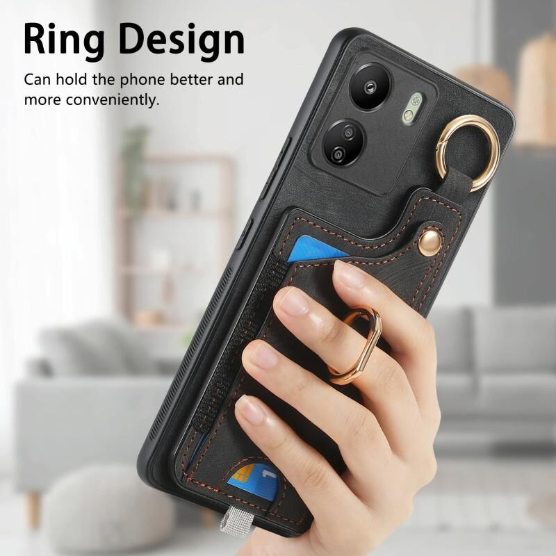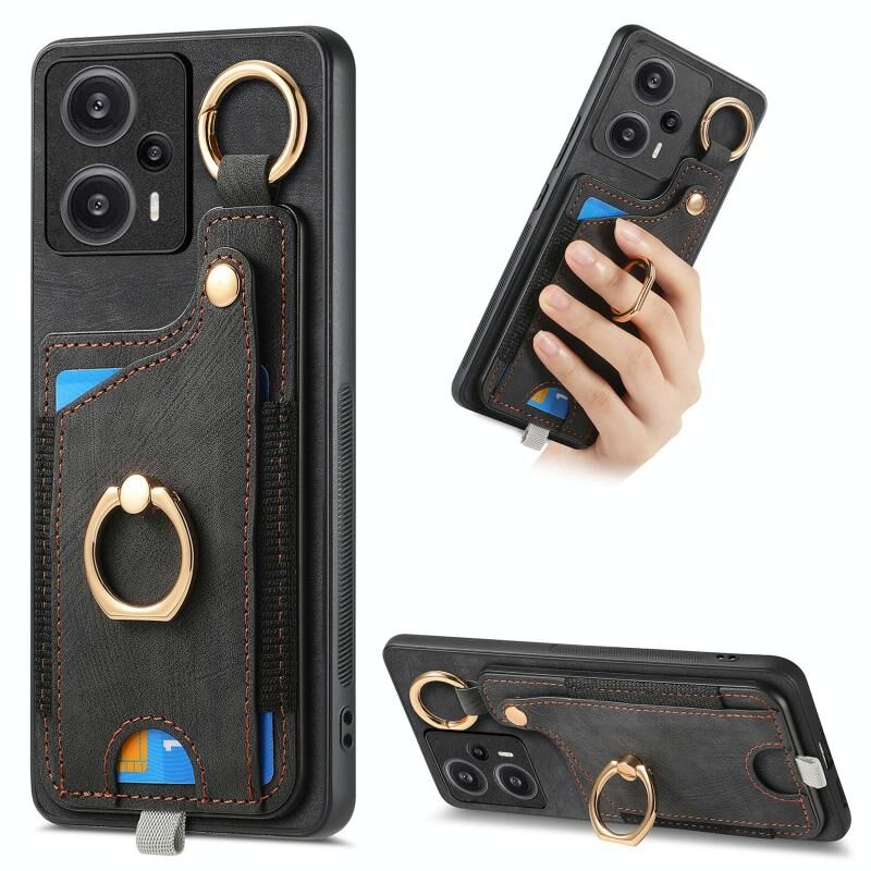 Για Redmi Σημείωση 12 Turbo Retro δέρμα-feel Ring Card τσάντα υπόθεση τηλεφώνου με Hang Loop (Μαύρο)