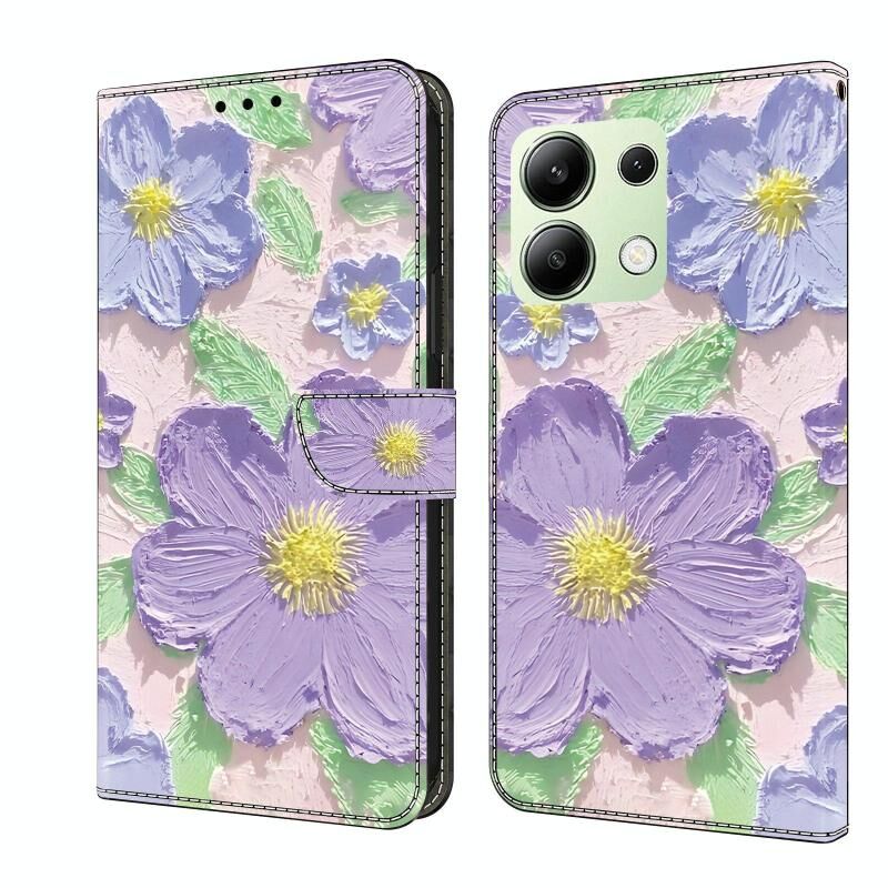 Θήκη τηλεφώνου από φρέσκο ​​βαμμένο δέρμα για Redmi Note 13 4G (Μωβ λουλούδια ζωγραφικής με λάδι)