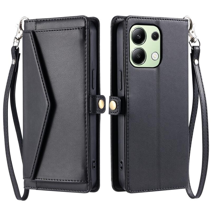 Για Redmi Σημείωση 13 4G Παγκόσμια πορτοφόλι πολλαπλών καρτών Slot Δερμάτινη θήκη τηλεφώνου με κορδόνι (Μαύρο)