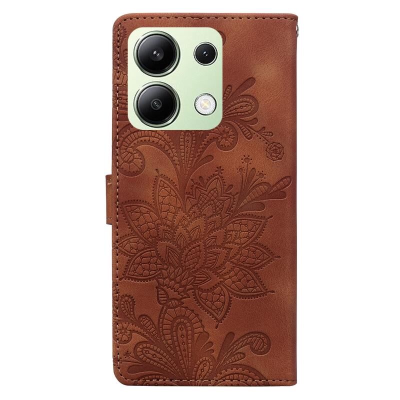 Θήκη τηλεφώνου για Redmi Note 13 4G με δαντελένιο floral ανάγλυφο, μαγνητικό κούμπωμα και λουρί καρπού (Καφέ)
