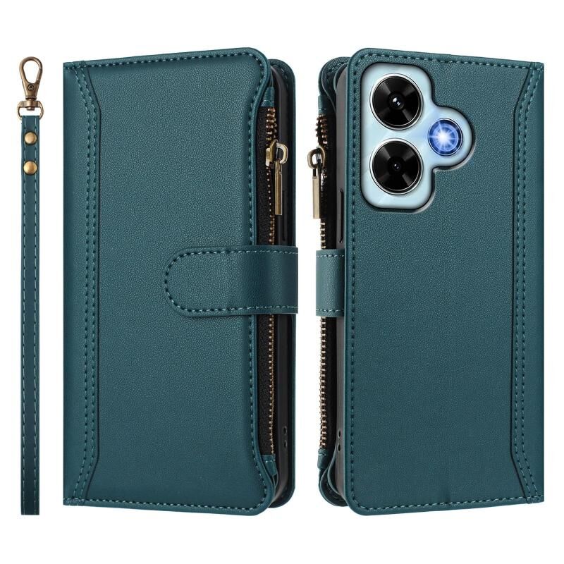 Για Redmi Note 13 4G Μαγνητικό Κλείσιμο 9 Θήκες Κάρτας Δερμάτινη Θήκη με Φερμουάρ και Λουρί Χεριού (Σκούρο πράσινο)