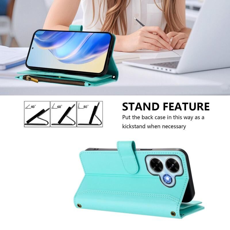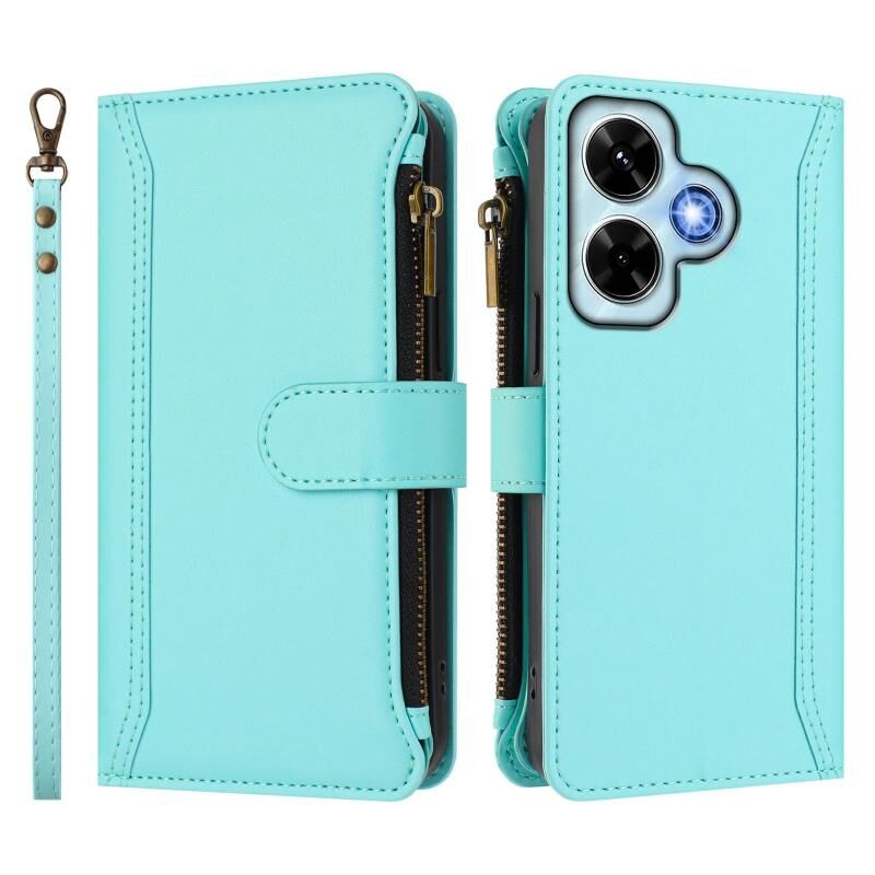 Για Redmi Note 13 4G Μαγνητικό Κλείσιμο 9 Θήκες Κάρτας Δερμάτινη Θήκη με Φερμουάρ και Λουρί Χεριού (Μέντας πράσινο)