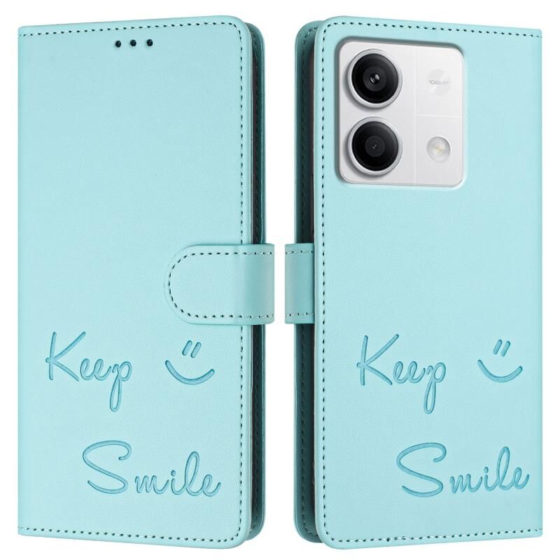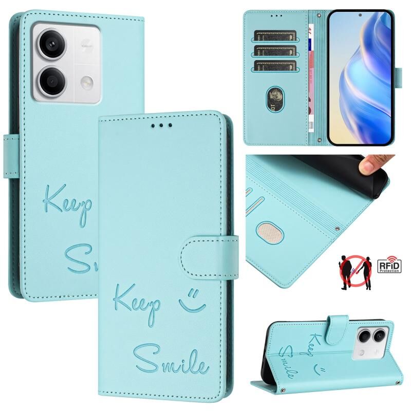 Για Redmi Σημείωση 13 5G Παγκόσμια χαμόγελο ανάγλυφο RFID δερμάτινη θήκη τηλεφώνου (Μέντας πράσινο)