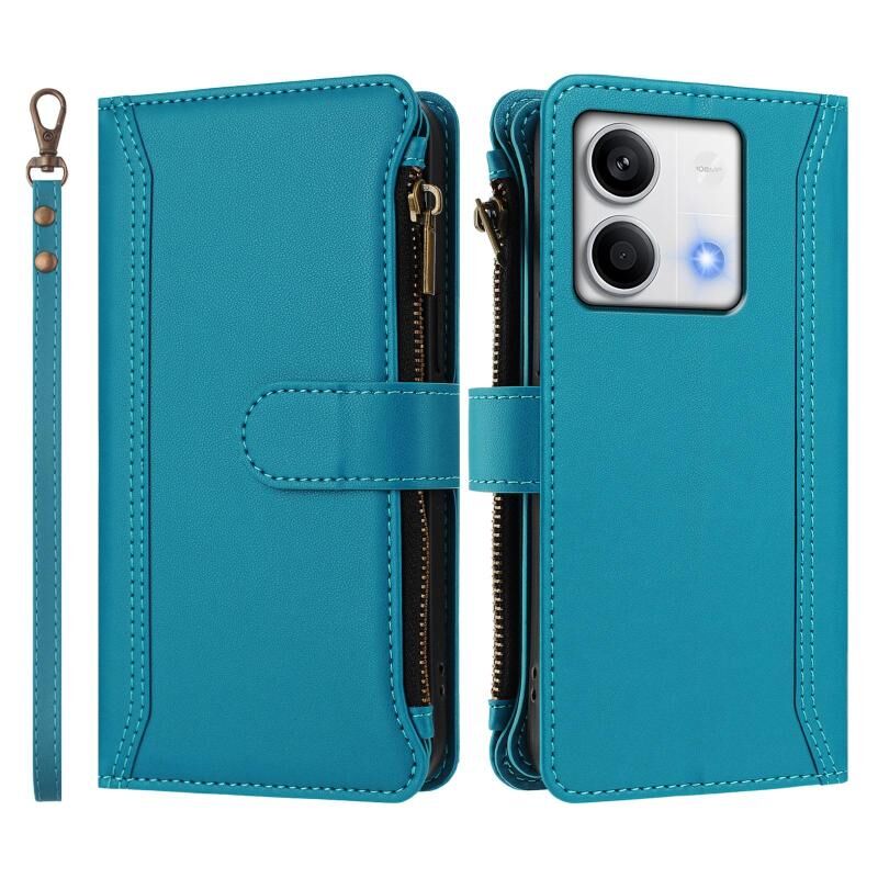 Για Redmi Note 13 5G Μαγνητικό Κλείσιμο 9 Θήκες Κάρτας Δερμάτινη Θήκη με Φερμουάρ και Λουρί Χεριού (Τουρκουάζ)