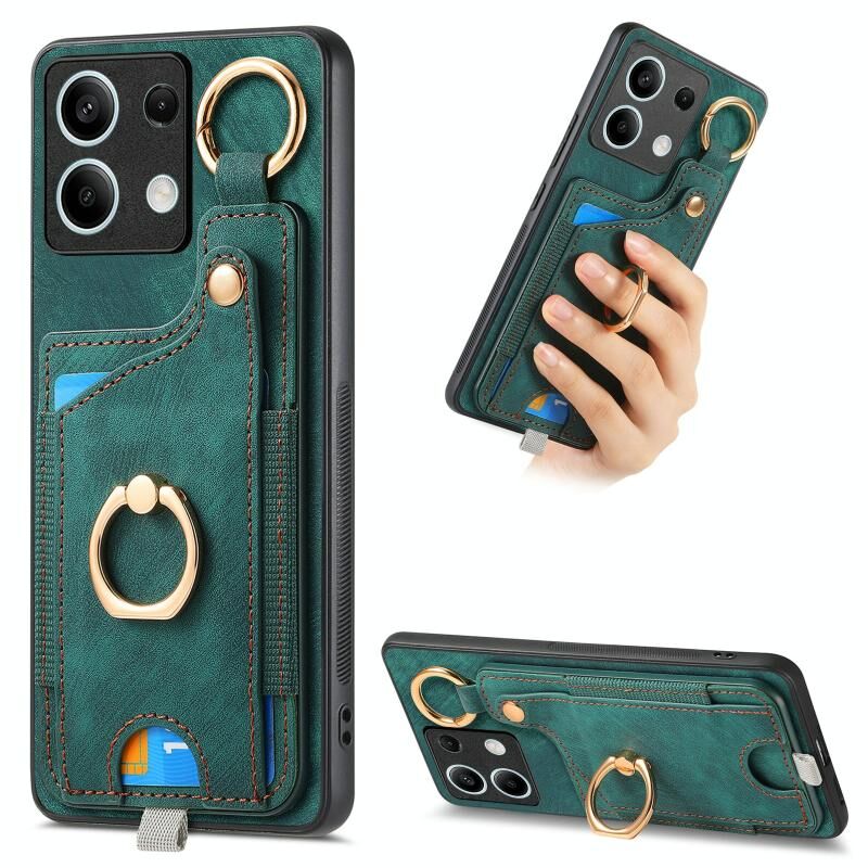 Για Redmi Σημείωση 13 5G Retro δέρμα-feel δέρμα-άισθησης δαχτυλίδι τσάντα κάρτα υπόθεση τηλεφώνου με Hang Loop (πράσινο)
