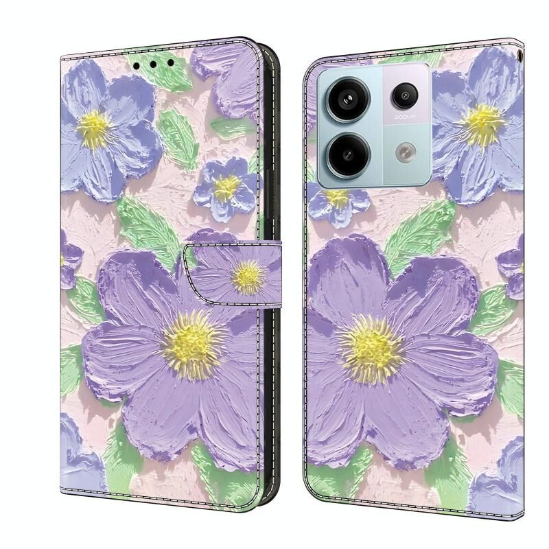 Θήκη τηλεφώνου από φρέσκο ​​βαμμένο δέρμα για Redmi Note 13 Pro 5G (Μωβ λουλούδια ζωγραφικής με λάδι)